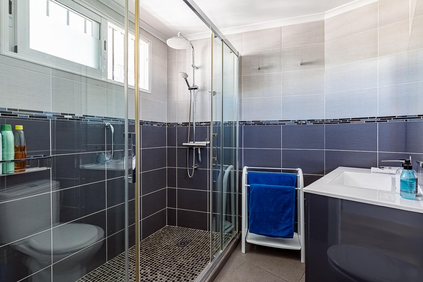 • Badezimmer mit Waschbecken, Dusche und Toilette