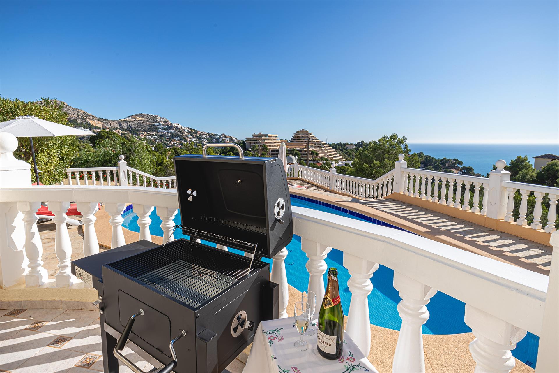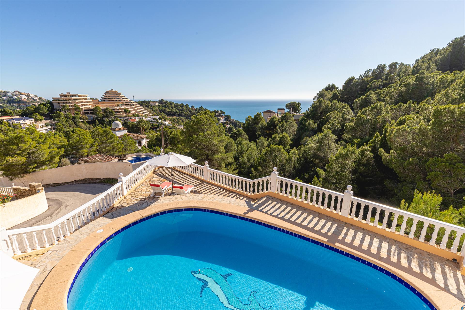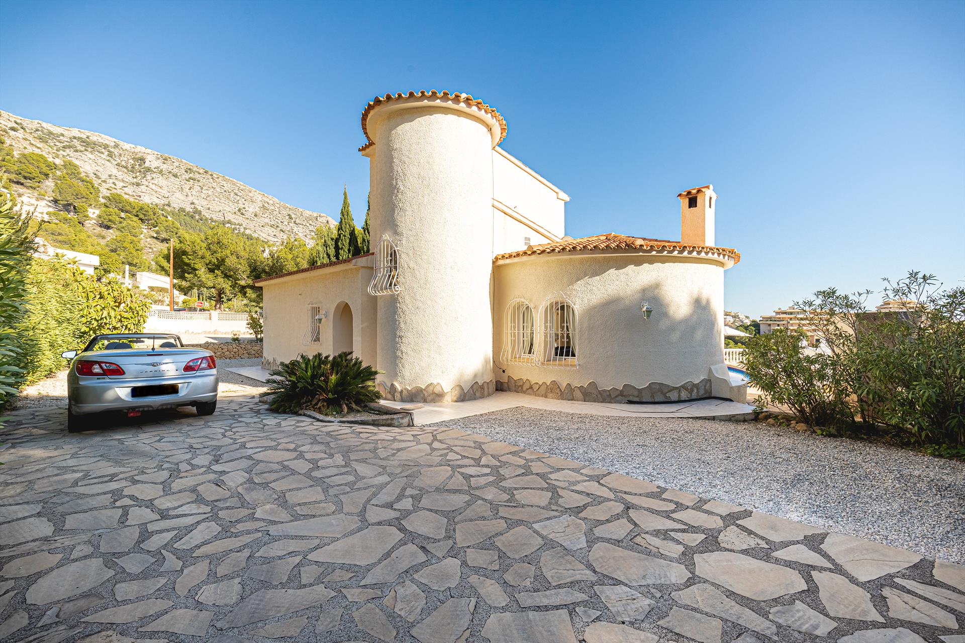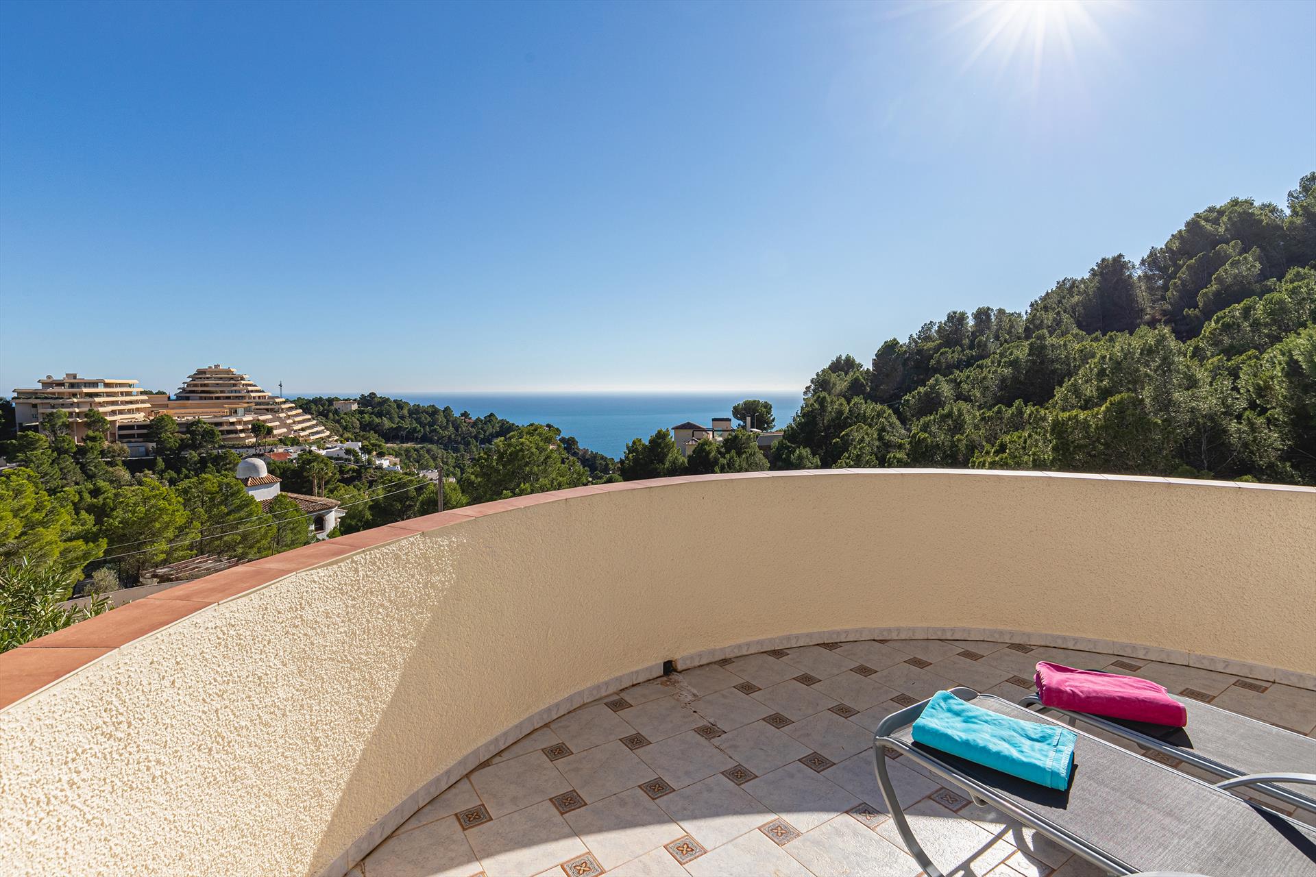 Gemütliche Villa in Altea, Costa Blanca, Spanien, mit beheiztem Pool für 6 Personen. Das Haus befindet sich in einer hügeligen, bewaldeten und Wohngegend.