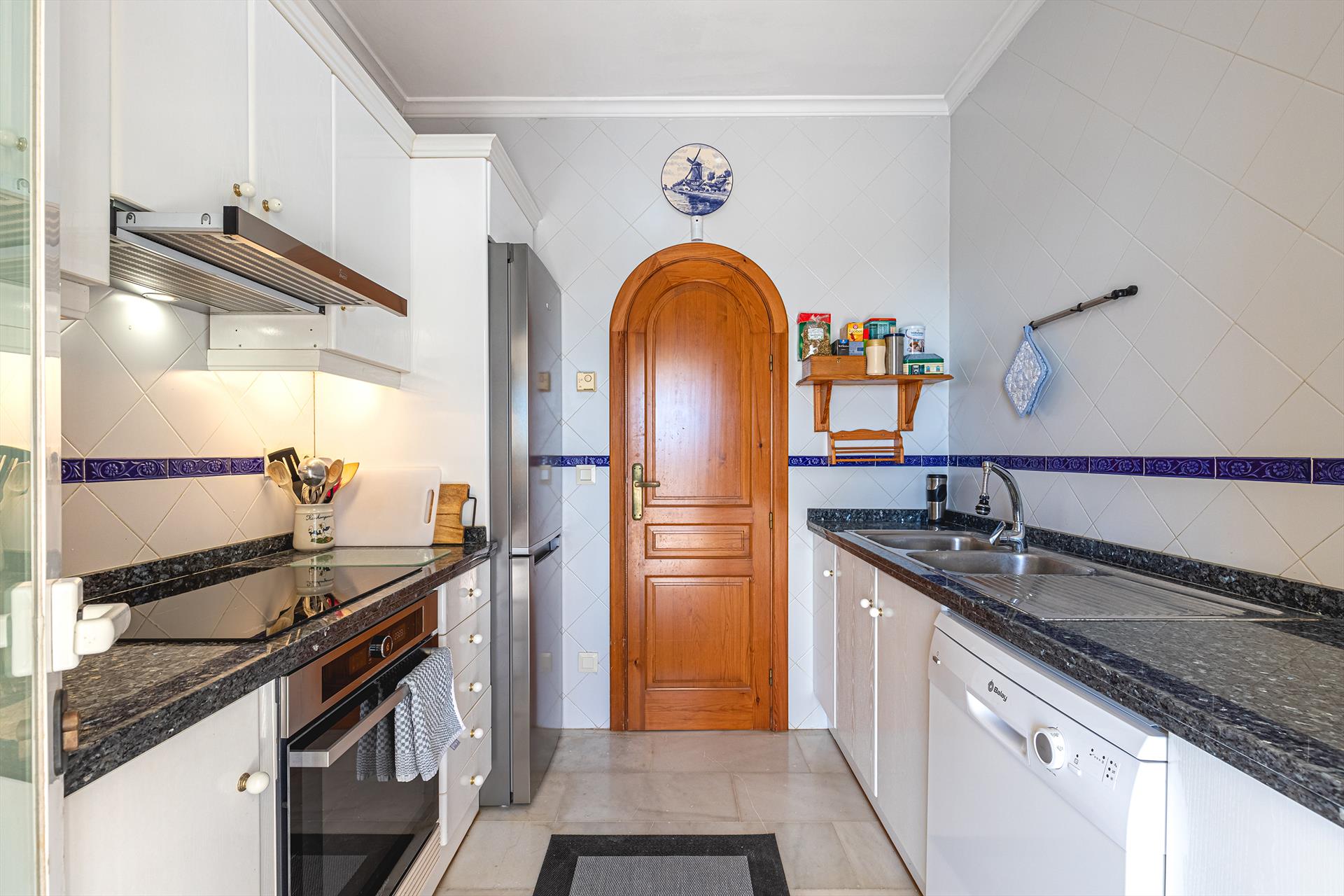 • Küche mit Elektrokochfeld, Elektroherd, Mikrowelle, Geschirrspüler, Kühlschrank, Kaffeemaschine, Wasserkocher und Toaster