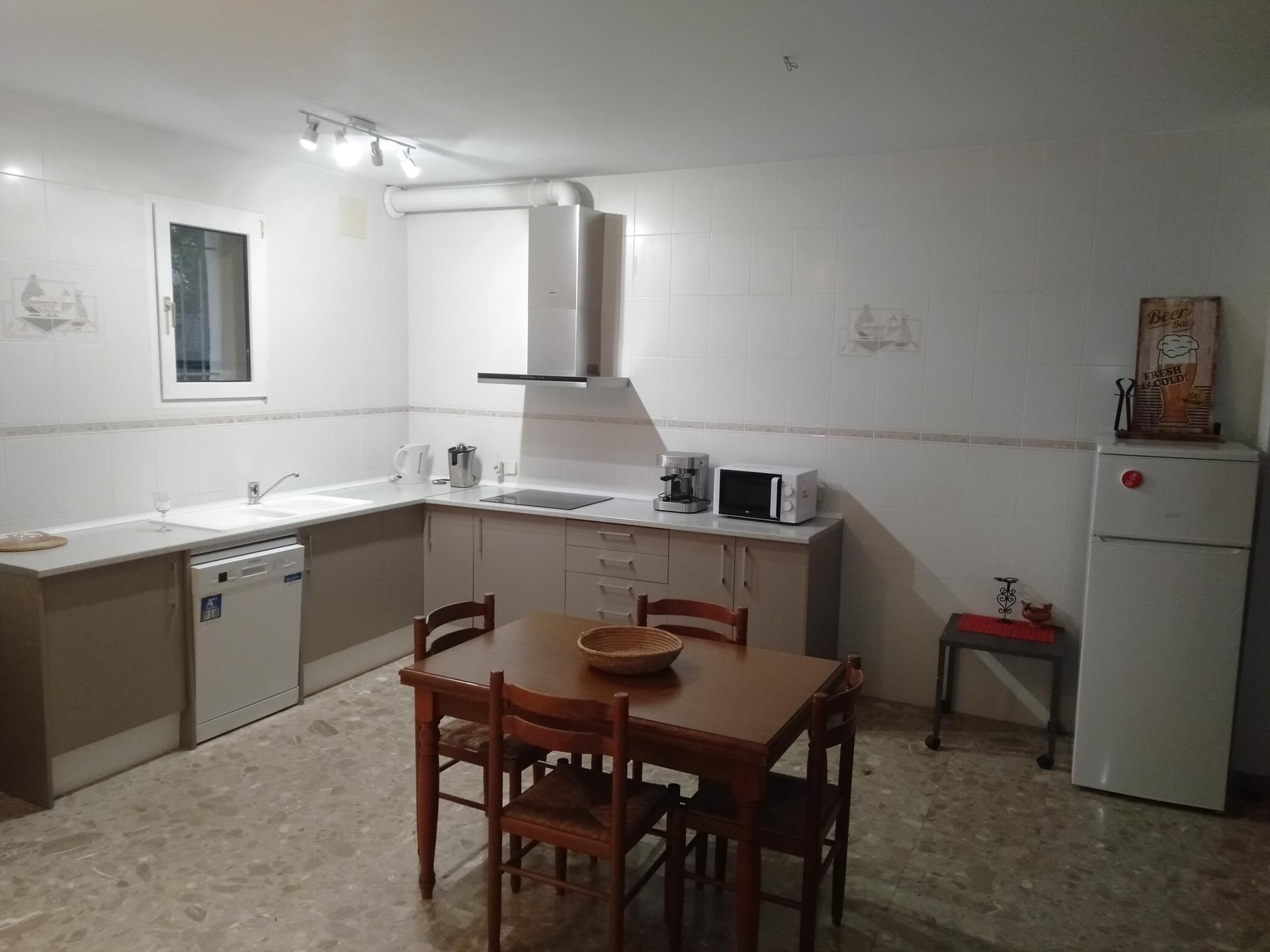 • Küche mit Essbereich mit elektrischem Kochfeld, Mikrowelle, Geschirrspüler, Kühlschrank mit Gefrierfach, Kaffeemaschine, Wasserkocher, Toaster und Entsafter