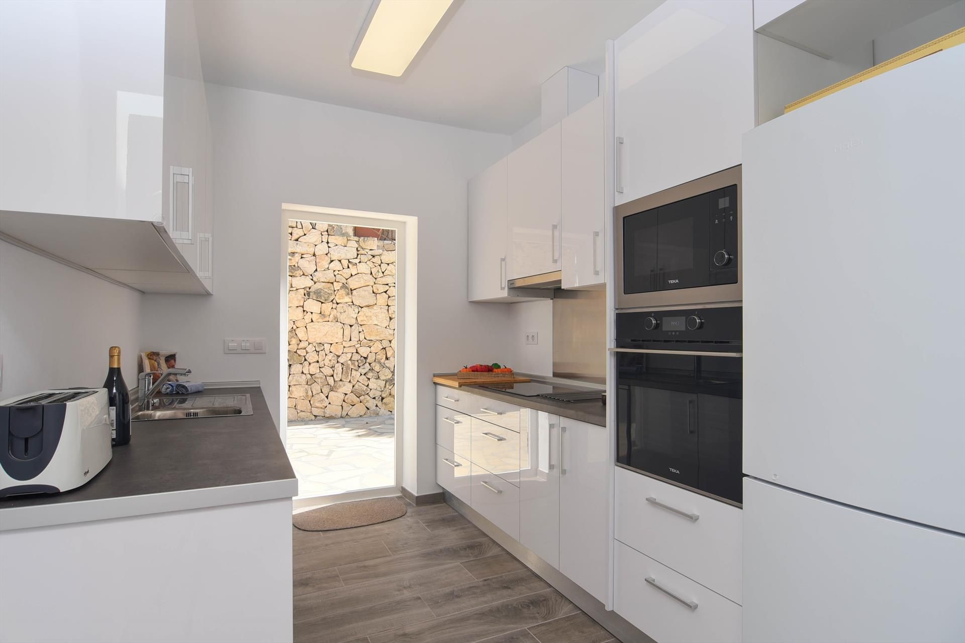 • Wohnküche mit Elektroherd, Elektroofen, Mikrowelle, Geschirrspülmaschine, Kühl-Gefrierkombination, Kaffeemaschine, Wasserkocher, Mixer, Toaster und Entsafter