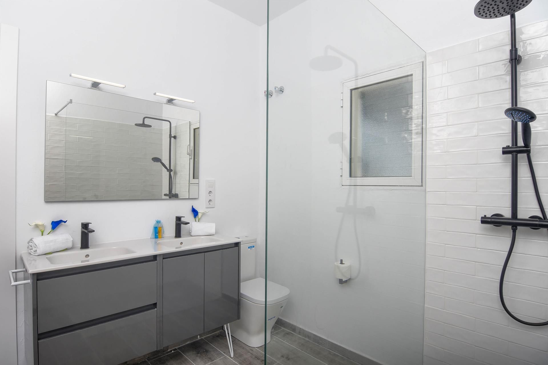 • Badezimmer mit Doppelwaschbecken, Dusche und Toilette