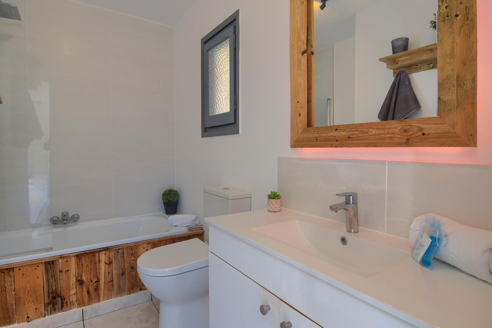 • ensuite Badezimmer mit Einzelwaschbecken, Badewanne, Dusche und Toilette