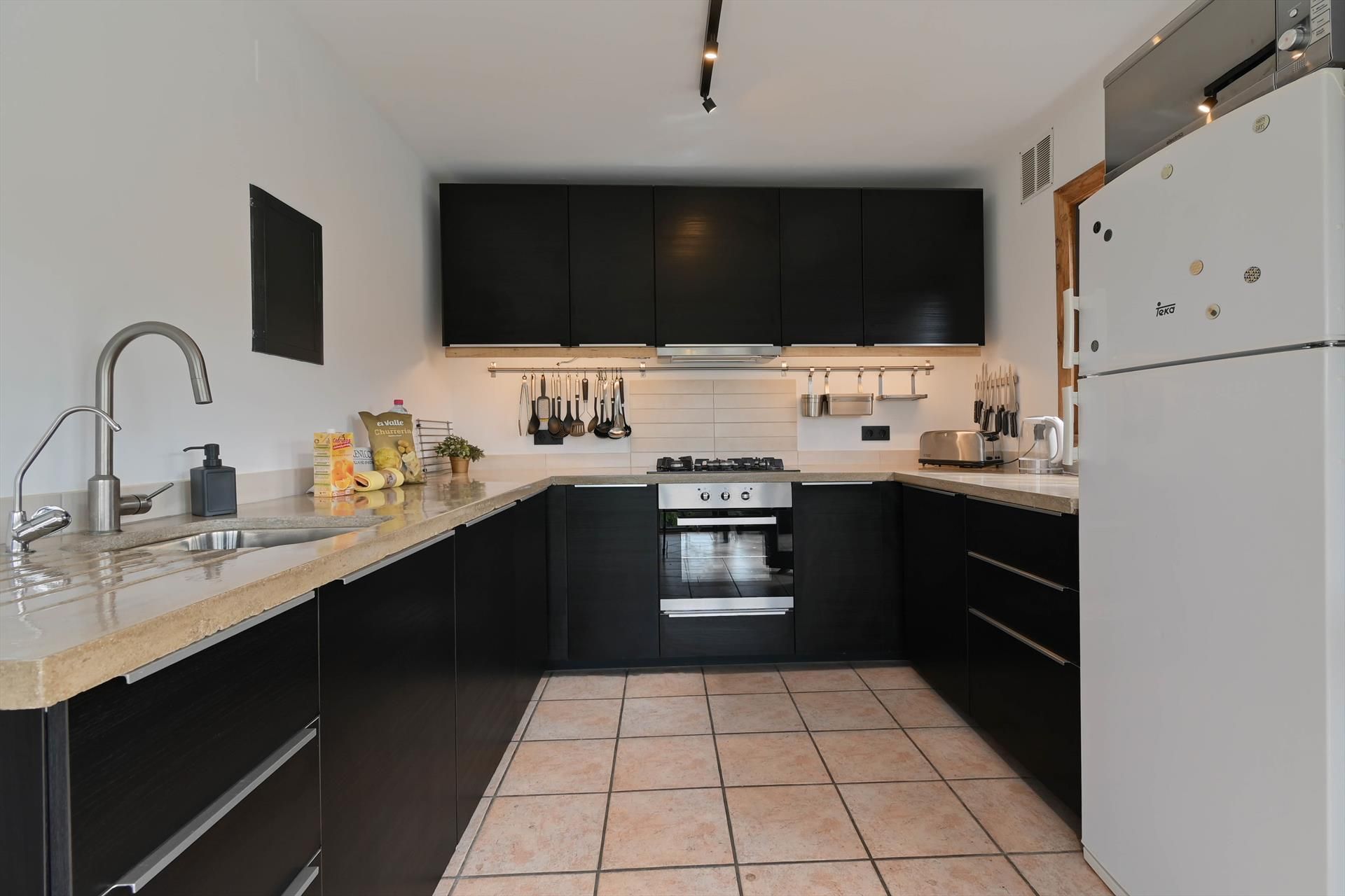 • Küche mit Gasherd, Elektroofen, Mikrowelle, Geschirrspülmaschine, Kühl-Gefrierkombination, Kaffeemaschine, Wasserkocher, Mixer, Toaster und Entsafter