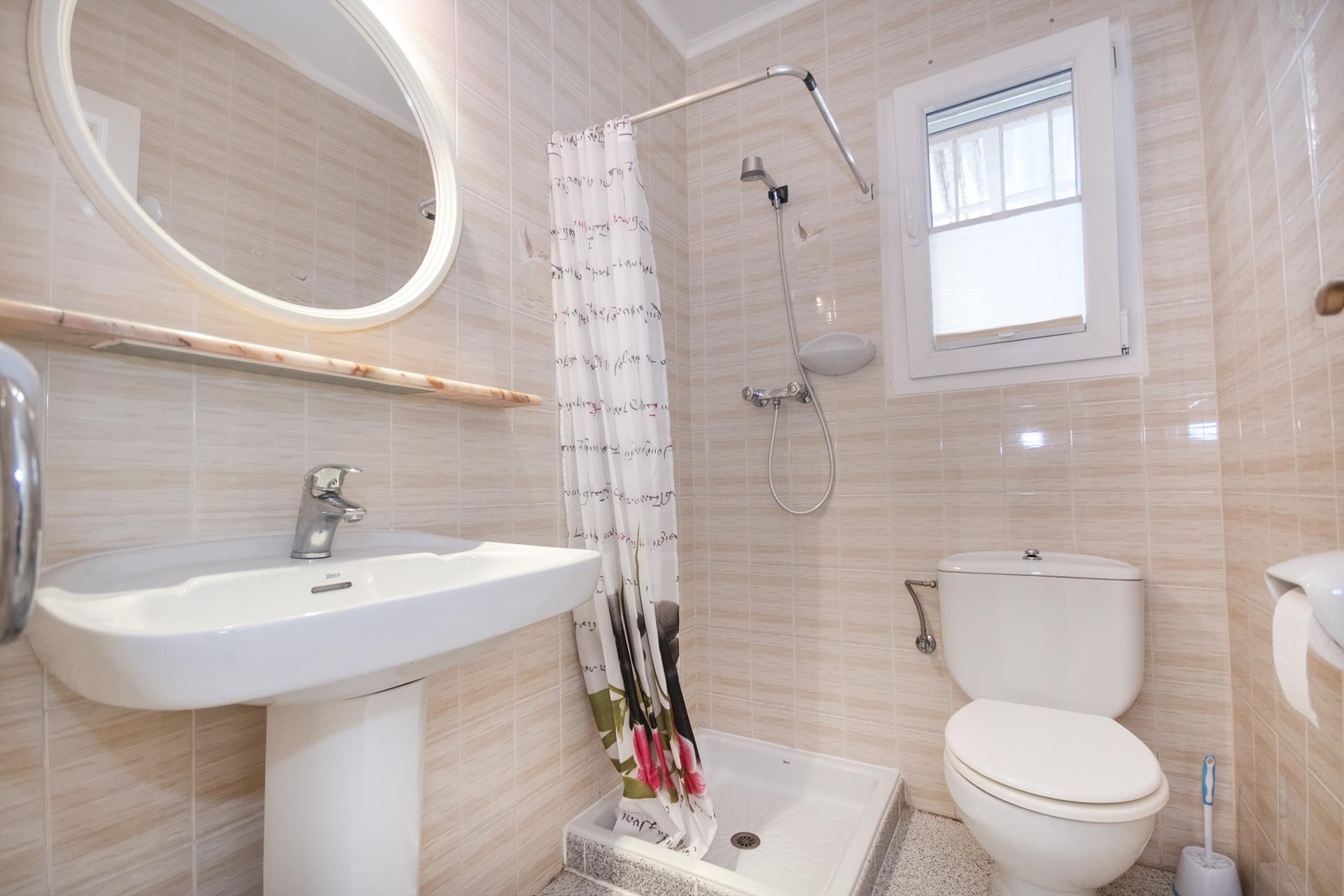 • Badezimmer mit Einzelwaschbecken, Dusche und Toilette