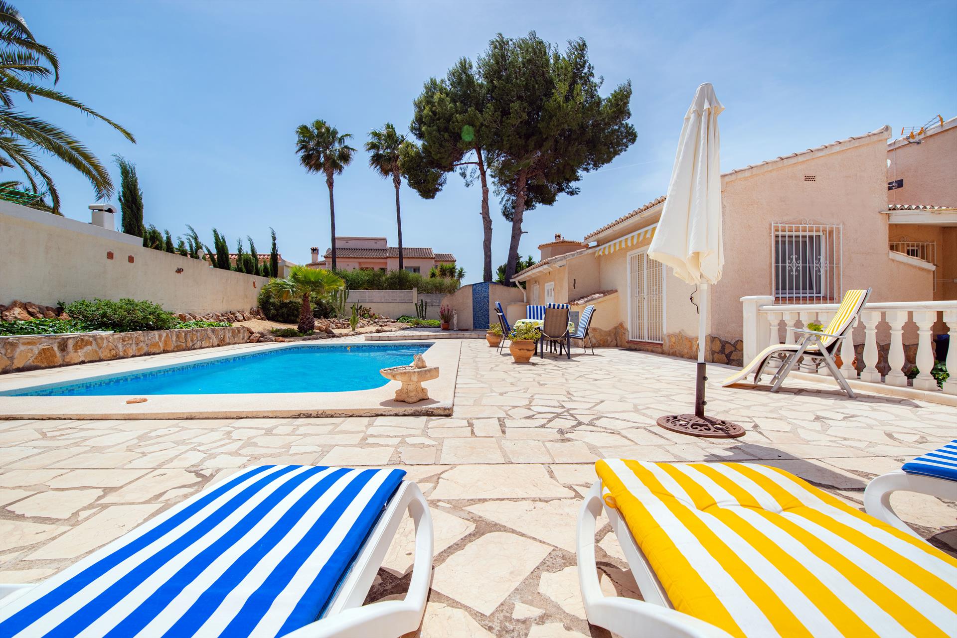 Die Unterkunft bietet 2 Schlafzimmer und 2 Badezimmer. Der Garten mit Kies, Bäumen und einem schönen Pool sorgt für eine angenehme Atmosphäre. Die Nähe zum Strand, Einkaufsmöglichkeiten, Sportaktivitäten, Nachtleben, Sehenswürdigkeiten und Kultur machen diese Villa zu einem perfekten Ort, um Ihren Urlaub in Spanien mit Familie, Freunden und sogar Ihren Haustieren zu verbringen.