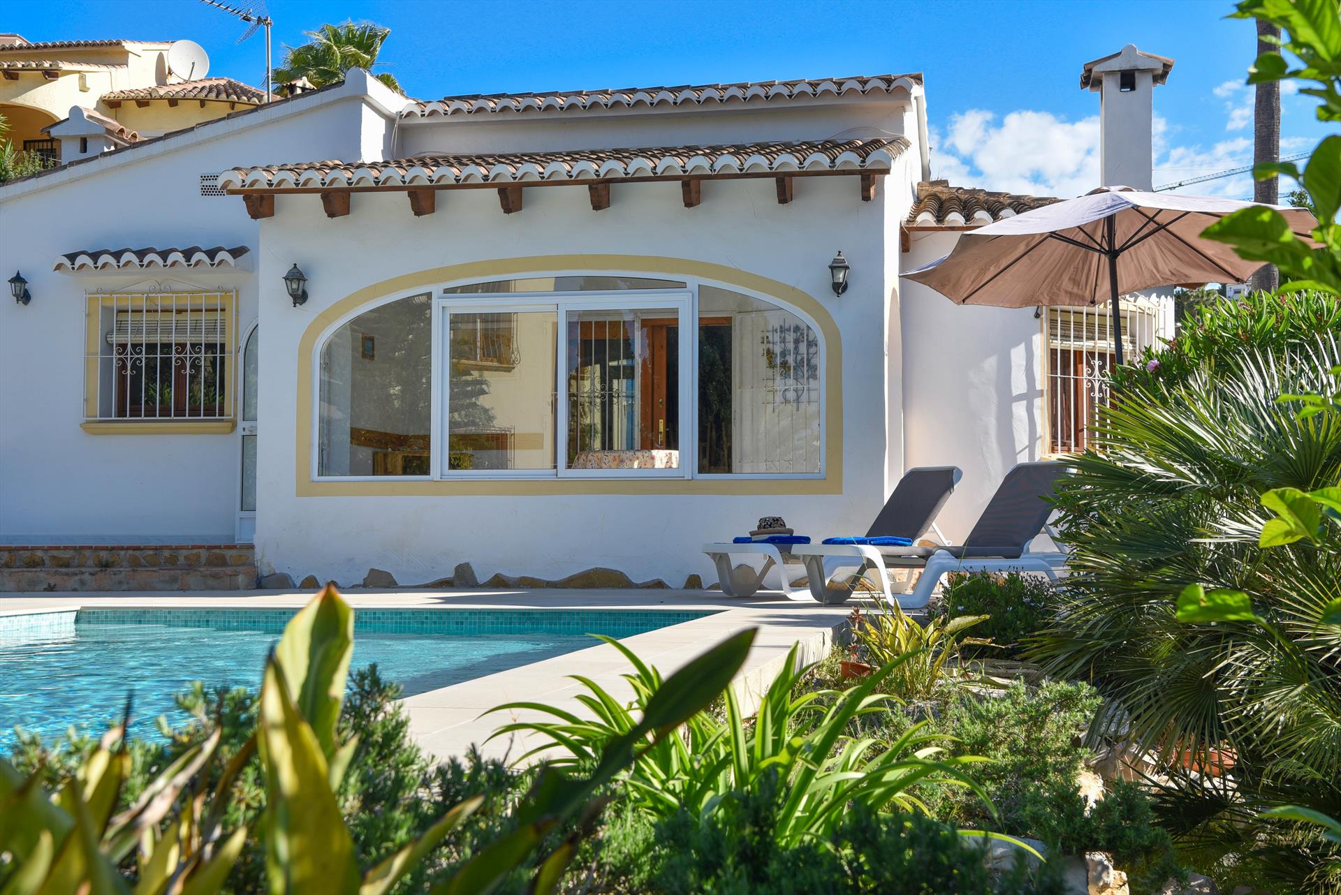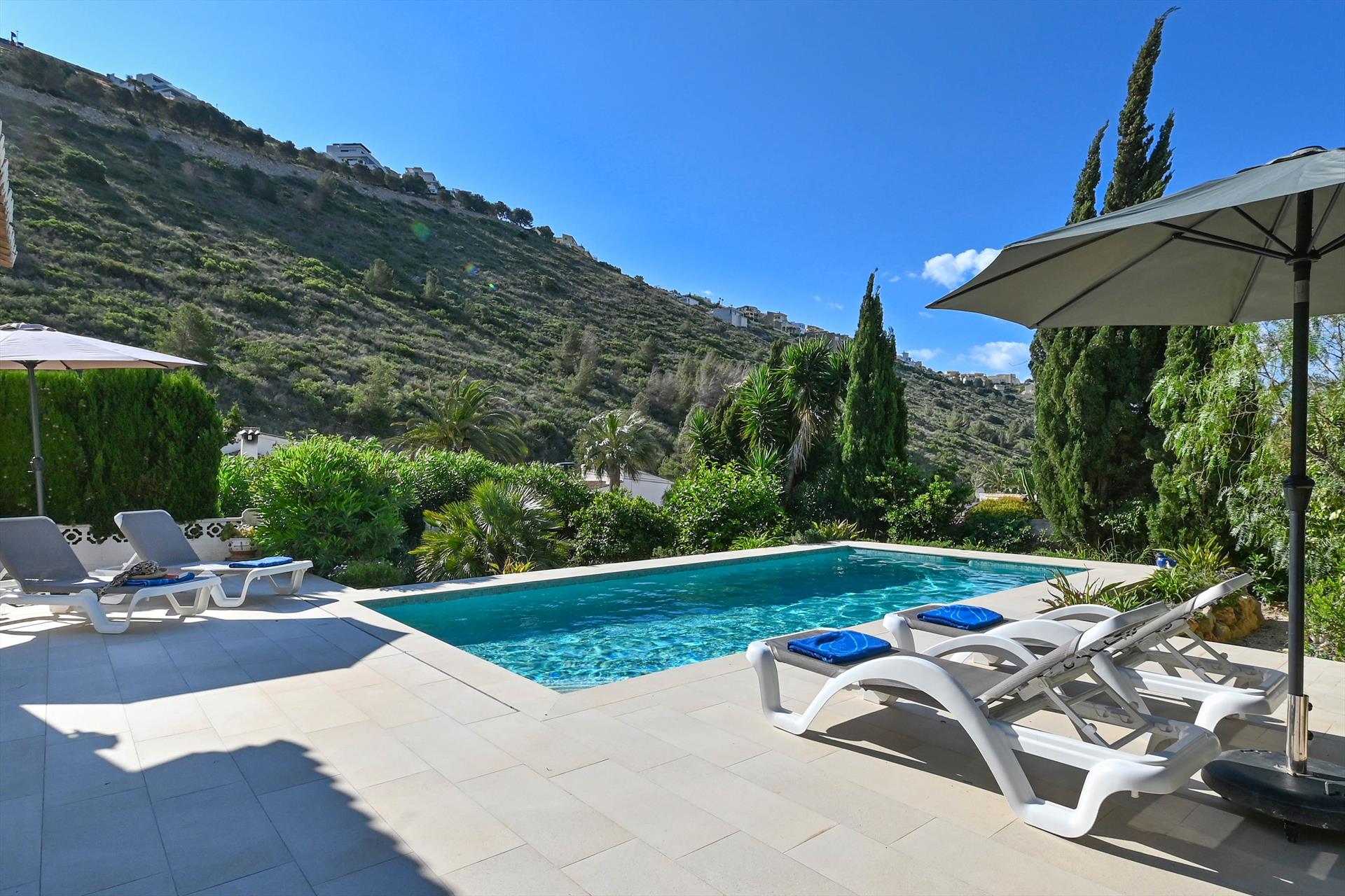 Schöne und gemütliche Villa mit privatem Pool in Benitachell, Costa Blanca, Spanien für 6 Personen. Das Haus befindet sich in einer hügeligen und residentiellen Umgebung, etwa 4 Km entfernt vom Strand von Cala Moraig und etwa 4 Km entfernt von Moraira.