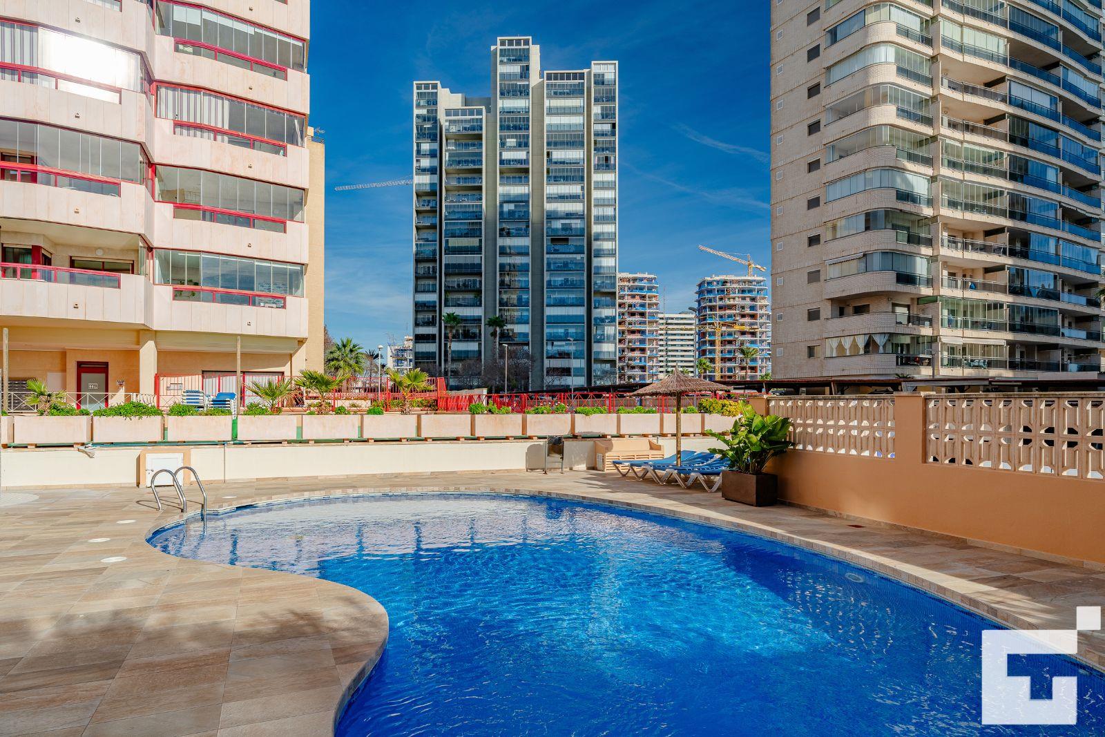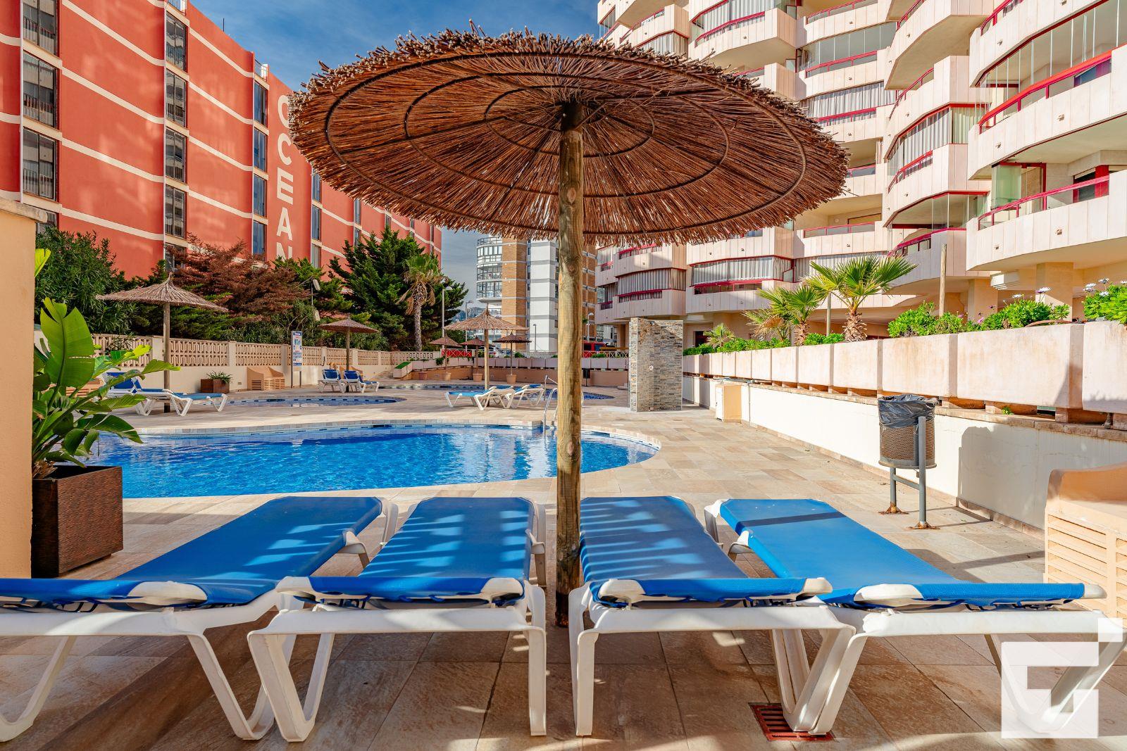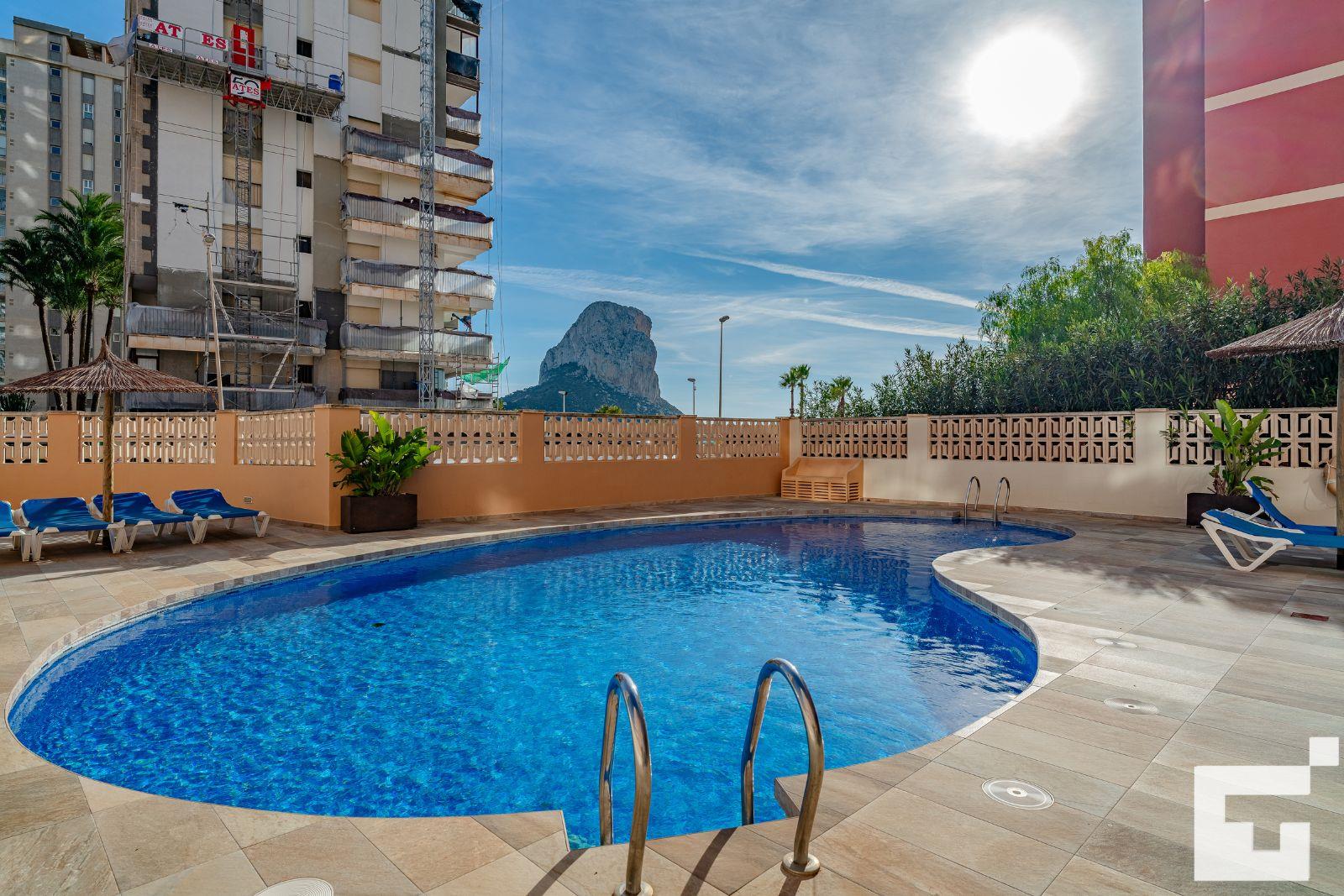 Apartment mit Gemeinschaftspool in Calpe, Costa Blanca, Spanien für 6 Personen. Das Apartment befindet sich in der Nähe von Restaurants und Bars, Geschäften und Supermärkten, nur 25 m vom Strand Playa Arenal-Bol entfernt.