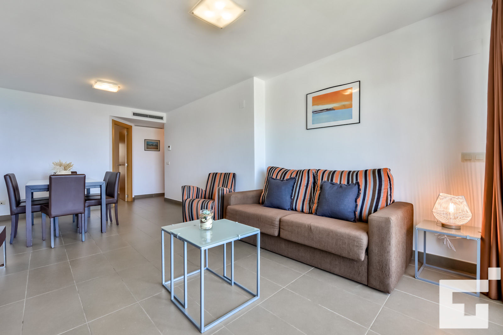 • Wohn-/Esszimmer mit Klimaanlage, Fernseher und Schlafsofa