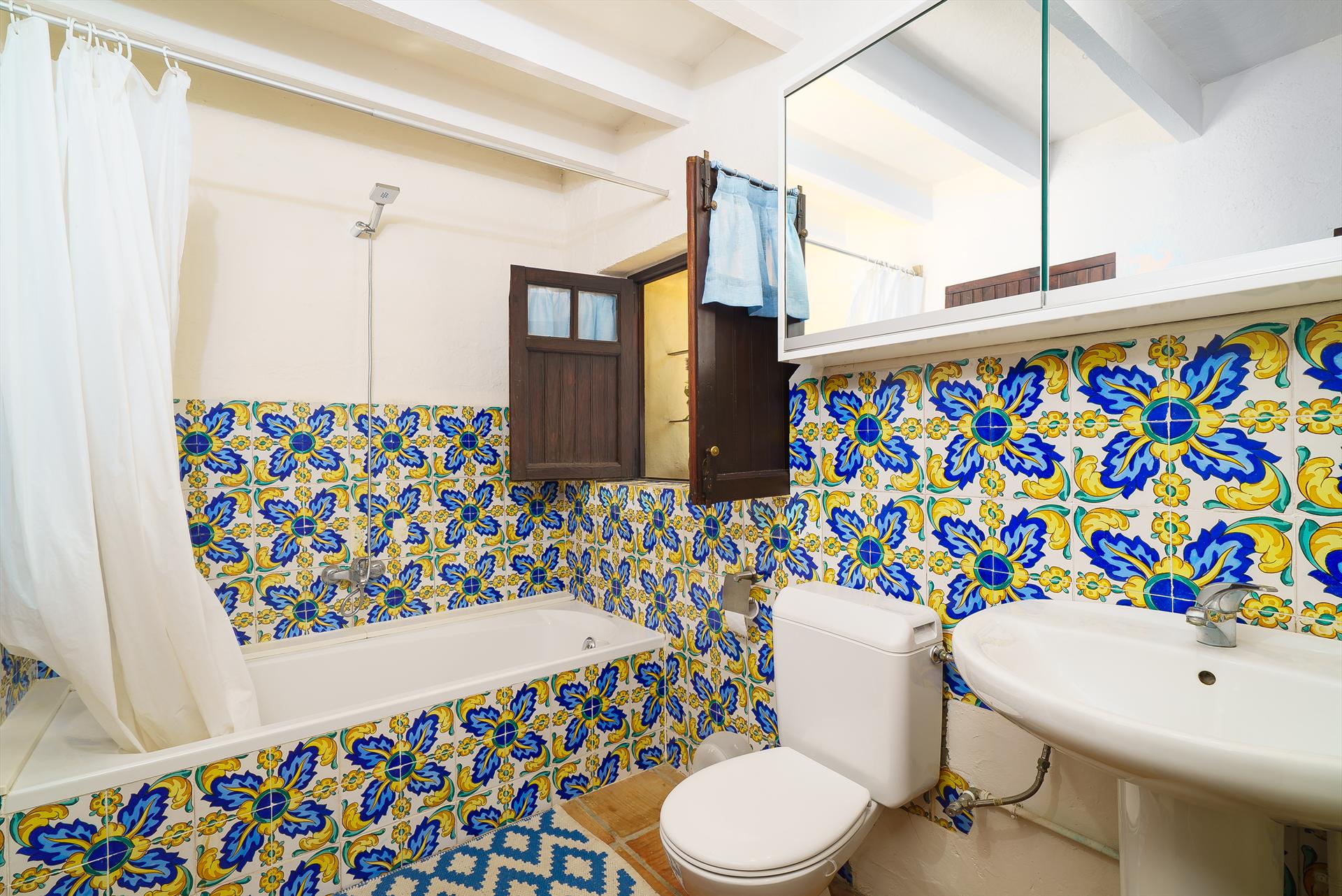 • Badezimmer mit Einzelwaschbecken, Badewanne, Dusche und Toilette