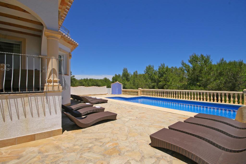Schöne und liebevolle Villa in Javea, Costa Blanca, Spanien, mit privatem Pool für 12 Personen. Das Haus befindet sich in einem hügeligen, bewaldeten Wohngebiet in Strandnähe, in der Nähe von Supermärkten und 4 km von La Granadella, dem Strand von Javea.
