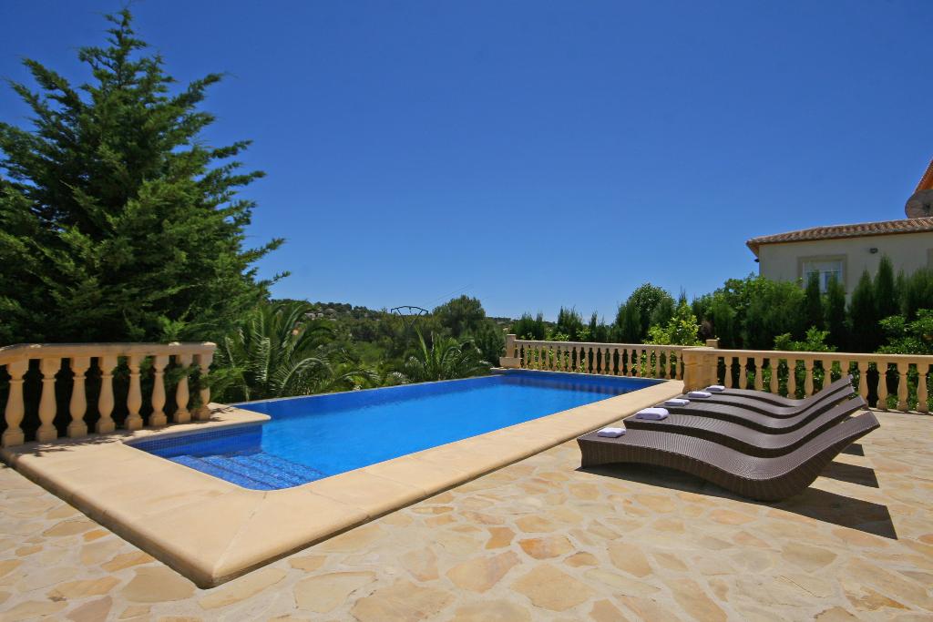 Grosse und komfortable Villa in Javea, an der Costa Blanca, Spanien mit privatem Pool für 8 Personen. Das Haus liegt in einer hügeligen, waldreichen und residentiellen Umgebung, in der Nähe von Supermärkten und etwa 4 Km entfernt vom Strand von La Granadella, Javea.