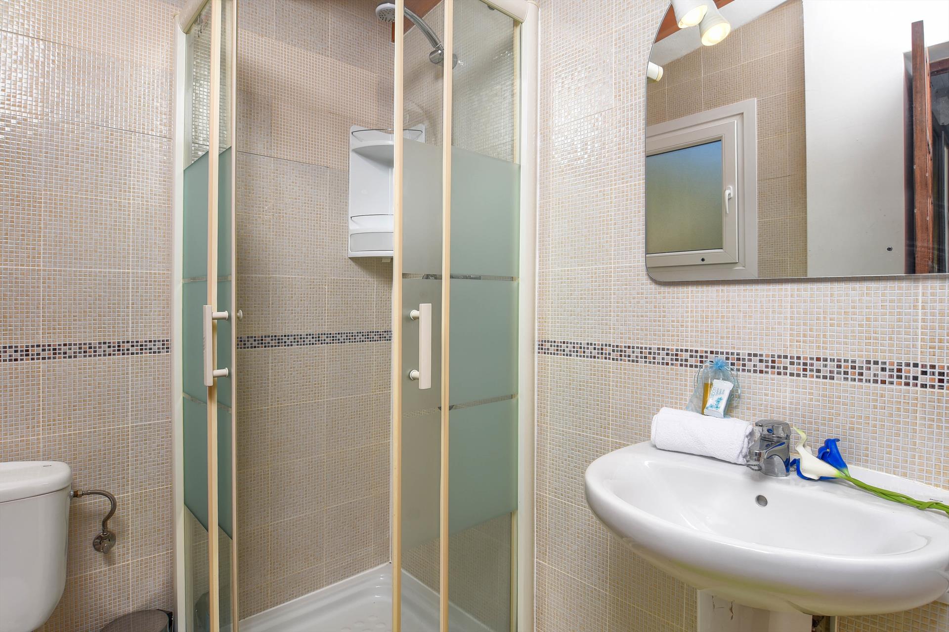 • Badezimmer mit Waschbecken, Dusche und WC