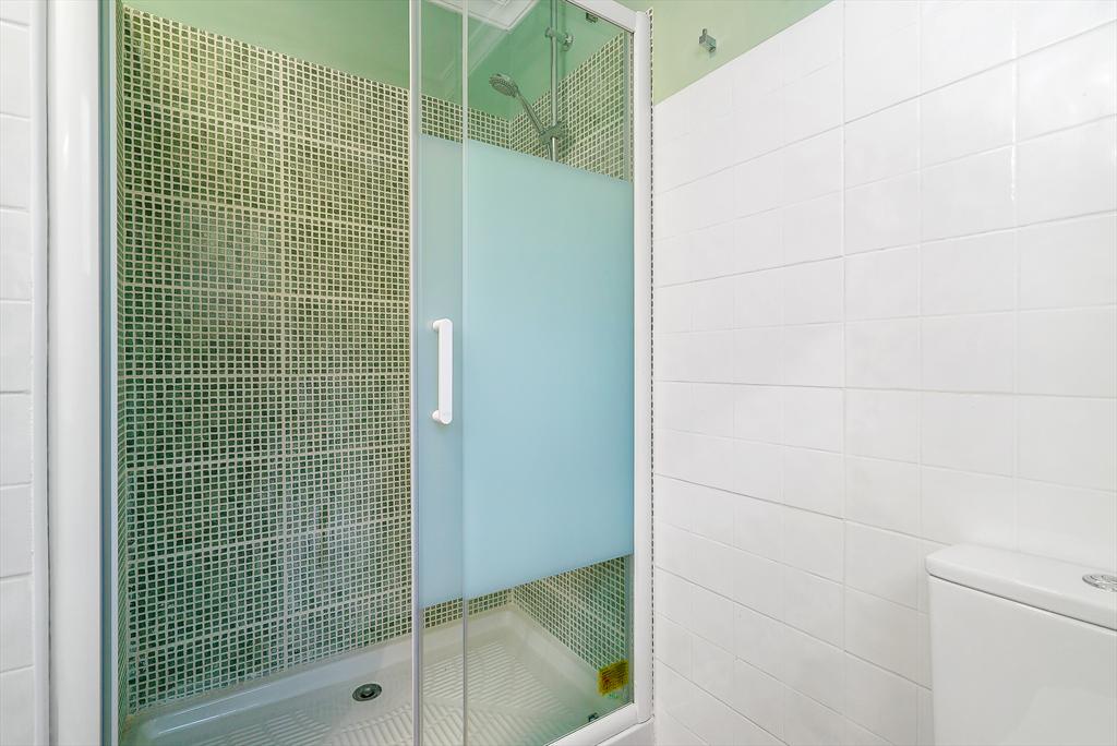 • Badezimmer mit Einzelwaschbecken, Dusche und Toilette