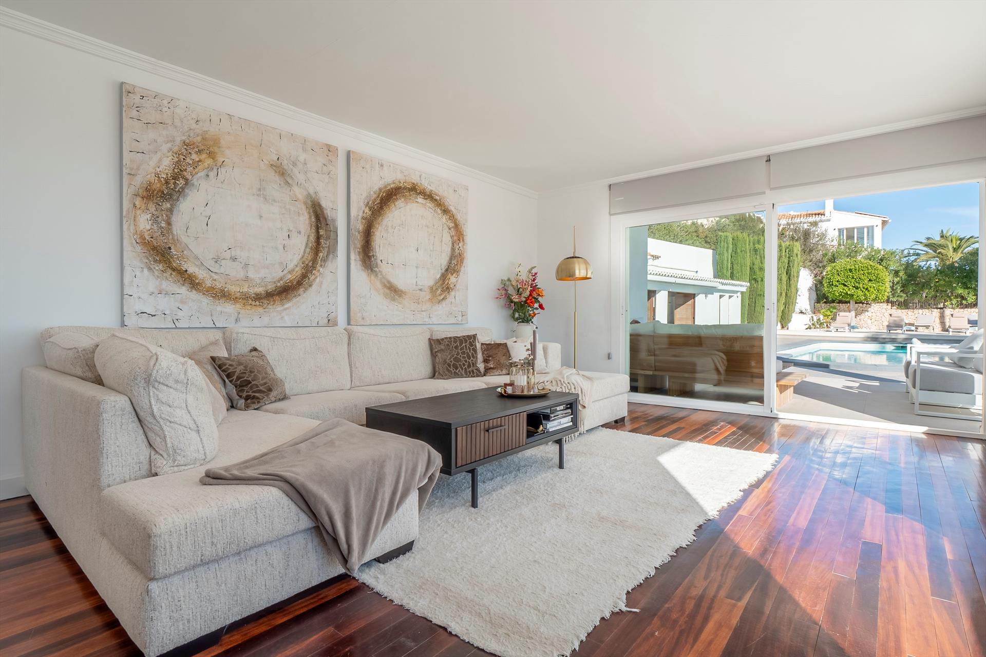 Moderne und komfortable Villa in Moraira, Costa Blanca, Spanien mit beheiztem Pool für 6 Personen. Das Haus befindet sich in einer hügeligen Wohngegend und ist 4 km vom Strand L'Ampolla entfernt.