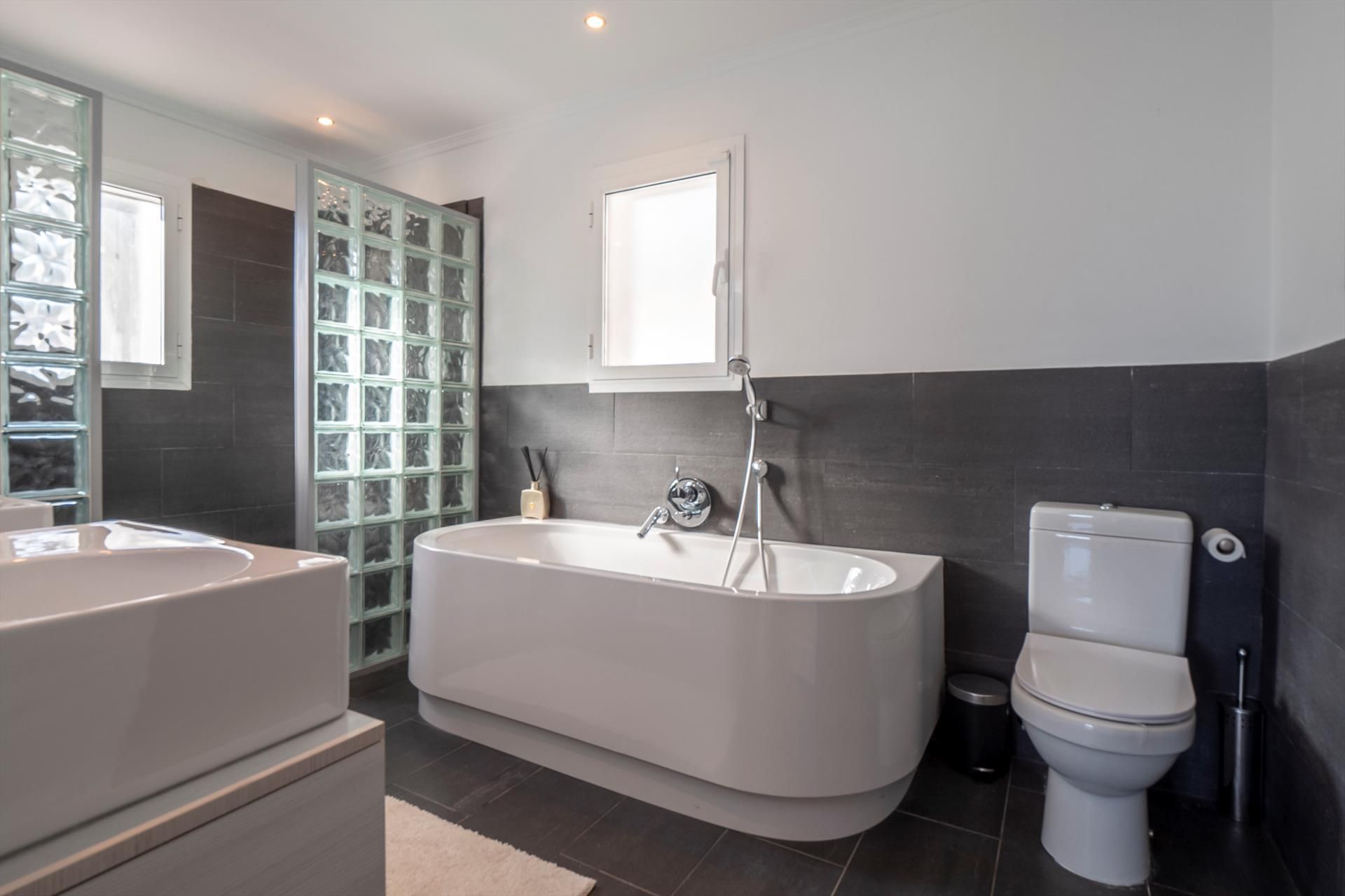 • Badezimmer mit Doppelwaschbecken, Badewanne, Dusche und Toilette